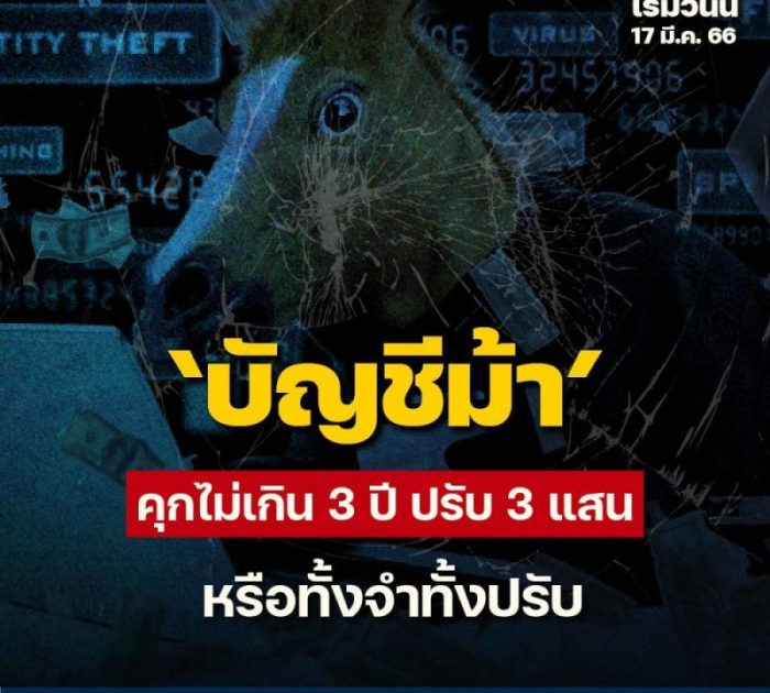เตือนเจ้าของบัญชีม้า ซิมม้า มีโทษหนัก ทั้งจำทั้งปรับ ตามราชกิจจานุเบกษา ที่ได้เผยแพร่พระราชกำหนด (พ.ร.ก.) มาตรการป้องกันและปราบปรามอาชญากรรมทางเทคโนโลยี พ.ศ. 2566 และกฎหมายเริ่มมีผลบังคับ ตั้งแต่วันนี้ 17 มี.ค. 66 เป็นต้นไป