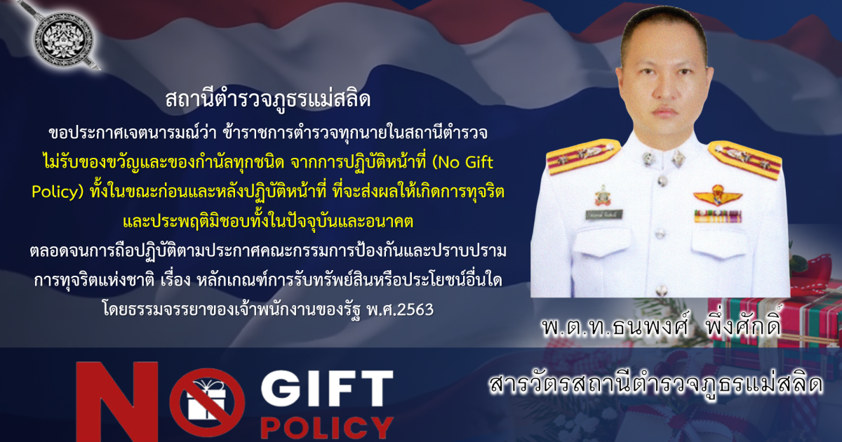 ไม่รับของขวัญและของกำนัลทุกชนิด จากการปฏิบัติหน้าที่ 23 เมษายน 2568 โดย admin / ข่าวประชาสัมพันธ์,ITA,ข่าวฝากประชาสัมพันธ์ Facebook iconFacebookTwitter iconTwitterLINE iconLine